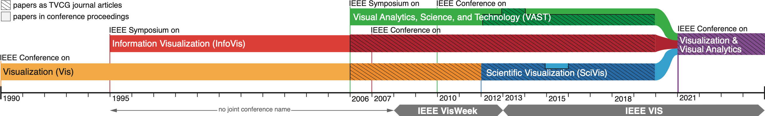 IEEE VIS has undergone many changes over its history. Founded in 1990 as the “IEEE Conference on Visualization”, it had a strong focus on topics that would have fit best into today’s SciVis conference. In 1995, the IEEE Symposium on Information Visualization (InfoVis) was held for the first time (the oldest surviving website is from 1996), and in 2005 the IEEE Symposium on Visual Analytics, Science and Technology (VAST) was established. InfoVis and VAST graduated to “conferences” from the “smaller” symposia in 2007 and 2011 respectively (using IEEE’s terminology). In the mid-2000s, VIS began a collaboration with the top journal for visualization research, IEEE Transactions on Visualization and Computer Graphics (TVCG), which now publishes most papers of these three conferences. All of this is well illustrated in this figure based on Isenberg et al.: